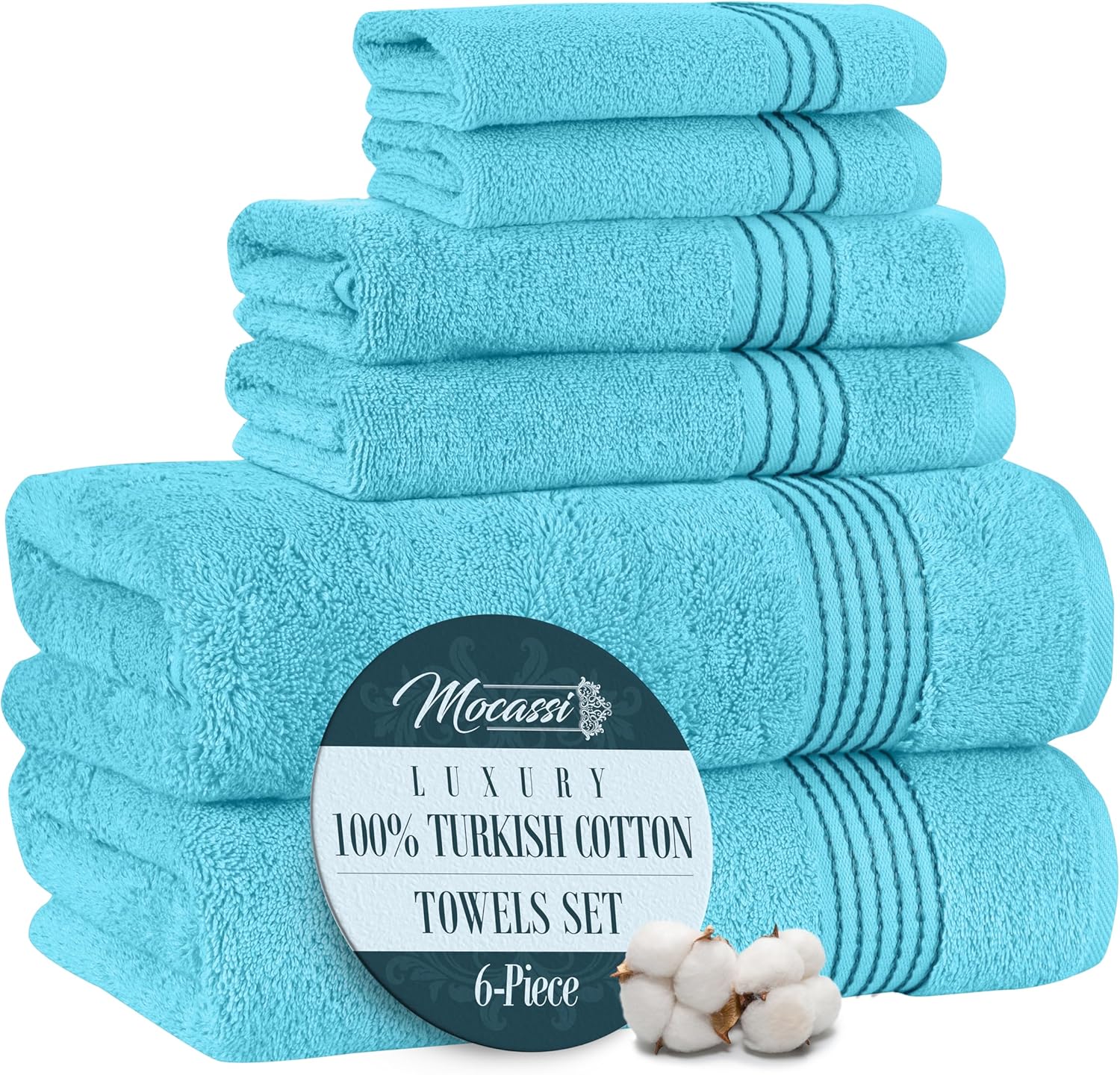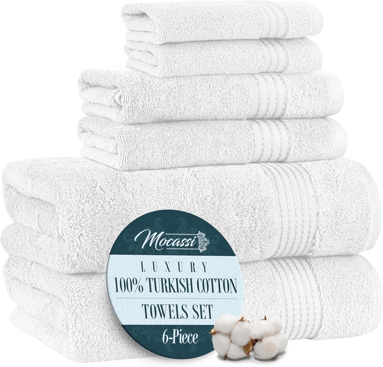 Upgrade your bathroom with our Mocassi premium 100% Turkish cotton 6-piece towel set, designed for luxury, softness, and maximum absorbency. These towels are ultra-soft, plush, and highly durable, ensuring a spa-like experience from the comfort of your home. Includes 2 Bath Towels (27 x 54 inches), large, absorbent, and quick-drying for ultimate comfort, 2 Hand Towels (16 x 28 inches), perfect for daily use in the bathroom, kitchen, or gym, and 2 Washcloths (13 x 13 inches), soft and gentle on the skin, ideal for cleansing and refreshing. Made from 100% authentic Turkish cotton, these towels feel incredibly soft against your skin, getting even softer and fluffier with every wash. Designed to withstand frequent washing, these towels maintain their quality, color, and plush texture for years to come. Our towels are OEKO-TEX Certified free from harmful chemicals, making them safe for you, your family, and the environment. This luxurious Mocassi 100% Turkish cotton towel set makes an excellent gift for housewarming, weddings, birthdays, and holidays. Treat yourself or your loved ones to the ultimate blend of comfort, quality, and elegance.